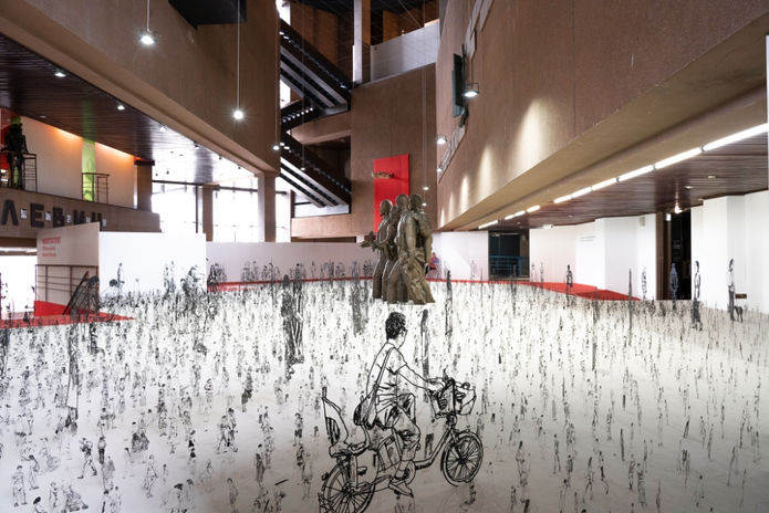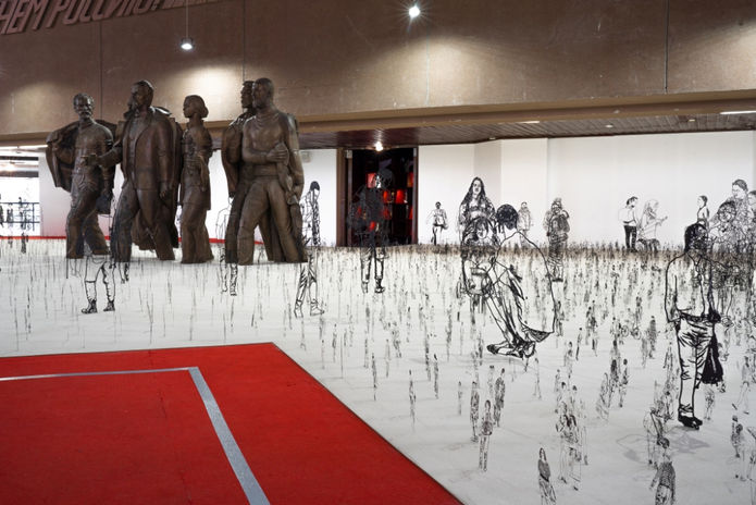 создана для разглядывания этой толпы, причем герои очень динамичные и характерные, среди них много мигрантов. Фигурки хорошо сочетаются с Лениным и товарищами, которые тоже потонули в этом песке и стали идти к коммунизму немного медленнее, чем шли раньше. Главная идея произведения в том, чтобы зритель заинтересовался людьми, которые окружают его в современном мире.